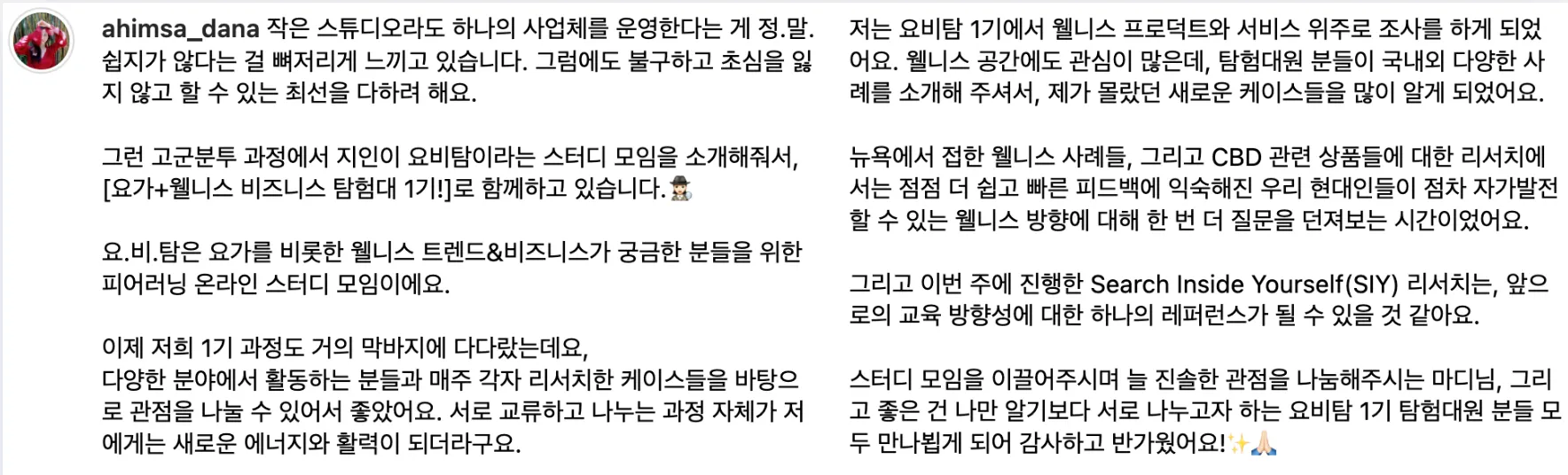 명상 크리에이터이자 요가원 누시마를 운영하시는 1기 단아님의 후기